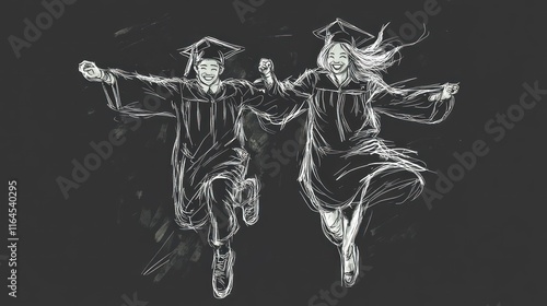Joyful graduates in caps and gowns jumping together.