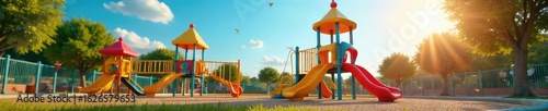 Joyful kids' playground scene with colorful equipment under a bright sunny sky Perfect for themes of fun, childhood, recreation, and outdoor play , ground cover, active, slides