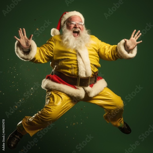 Jumping for Joy: Santa Claus in a Yellow Suit with a Big Smile.Yellow Suit Santa: Joyful Jumps and Smiles Abound