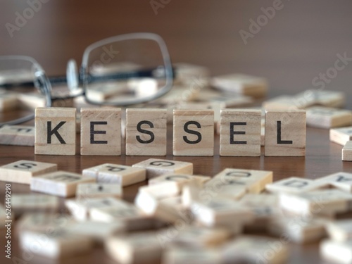 kessel Wort oder Konzept dargestellt durch hölzerne Buchstabenfliesen auf einem Holztisch mit Brille und einem Buch