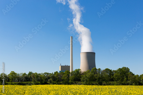 Kohlekraftwerk mit Kühlturm und Raps im Vordergrund
