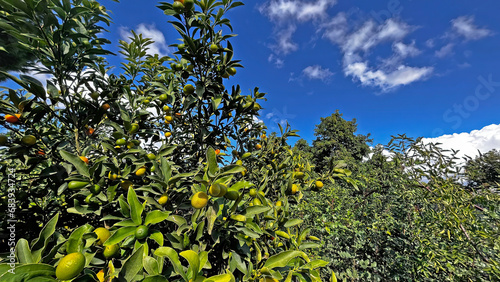 Kumquat plant and its fruits. In Turkish it is called "Kumquat" or "Kamkat" or "Kumquat". Indoor plants. Blue and cloudy sky background.