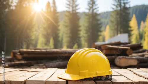 Labor day, yellow hard hat and plaid shirt resting on a wooden surface, with a blurred sunny outdoor background