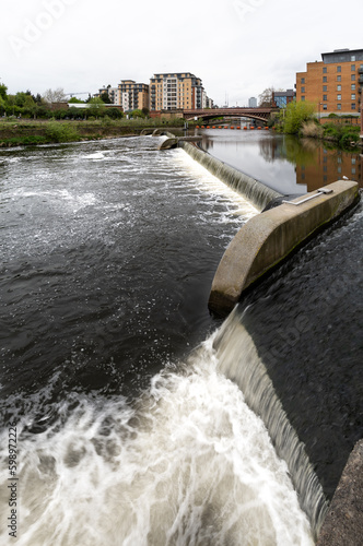 Landscape view of the weir on the River Aire at Leeds Dock