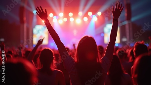 Large happy crowd partying together at an outdoor summer music festival facing a main stage with powerful colorful stage lights hands raised