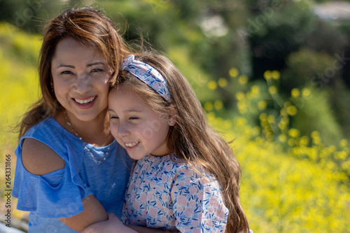 Latina Mother and Daughter Smiling and laughing on a hill in front of yellow flowers