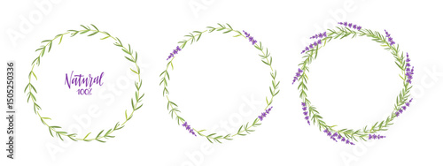 Lavender flowers frames. Circle Lavender wreaths with Natural 100 percent. Vector lavender grass Illustration. Flowers and green twigs borderы for inscriptions, logo, packaging, sales, advertising.