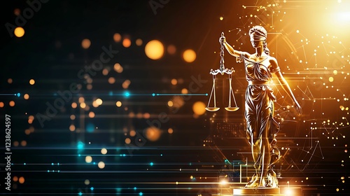 lawyer legal, ethics, justice, law, statue. A digital representation of Lady Justice holding scales, illuminated by glowing lights, symbolizing law, order, and fairness.