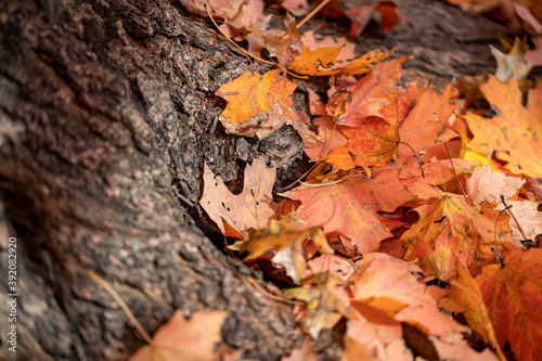 Leaves lay on the grass under a tree in the North Meadows of Central Park, New York City