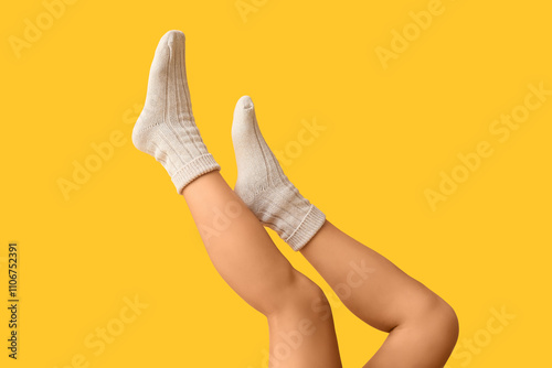 Legs of young woman in cotton socks on yellow background