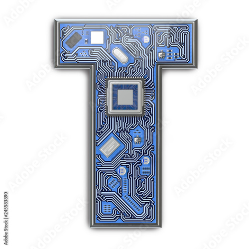 Letter T. Alphabet in circuit board style. Digital hi-tech letter isolated on white.