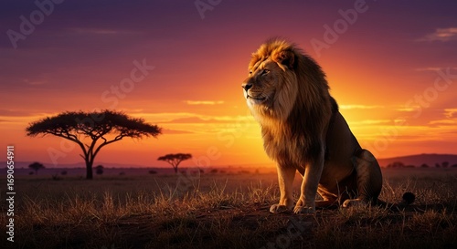 Lion sits regally in African savanna Sunset paints vibrant backdrop acacia silhouettes stand afar Grassy foreground details