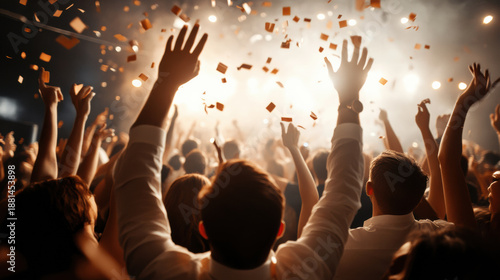 Lively crowd raising hands and celebrating with confetti at vibrant party or concert full of energy and excitement