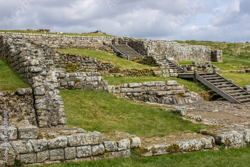 Looking out over the ruins of the barracks at Housestead fort, a Roman Fort along Hadrians Wall in Northumberland National Park, Northern England.