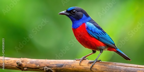 Lovely blue bird with black and red bills perched on a wooden branch over a clean green background