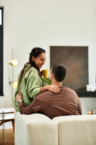 Loving couple shares warm laughter and comfort in their modern apartment