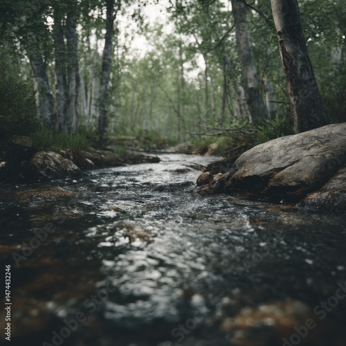 Low angle close up of stream flowing through birch forest in Sweden with rocks and green foliage