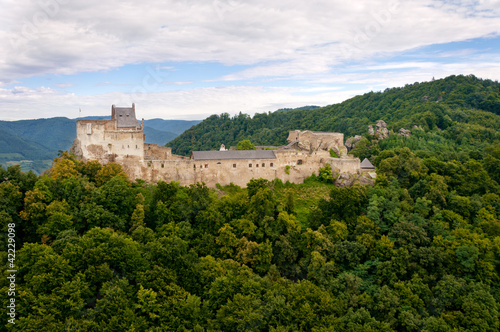 Luftaufnahme von der Burgruine Aggstein im Sommer.