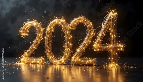 Luminous wire-frame depiction of the year 2024 with sparkles on a dark background
