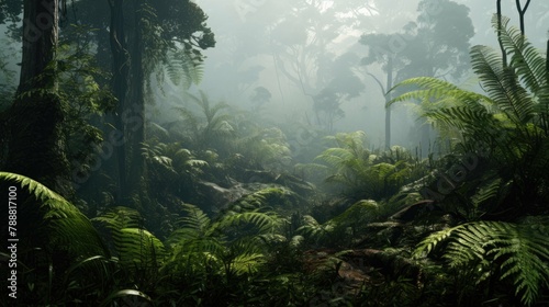 lush green foliage of a dense jungle with sunlight streaming through the canopy