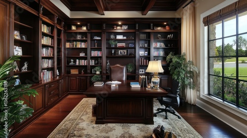 Luxurious Home Office with Wooden Bookshelves