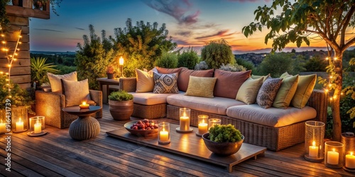 Luxurious terrace filled with cushions and candles, creating a cozy ambiance in a garden at night , luxury, terrace, cushions