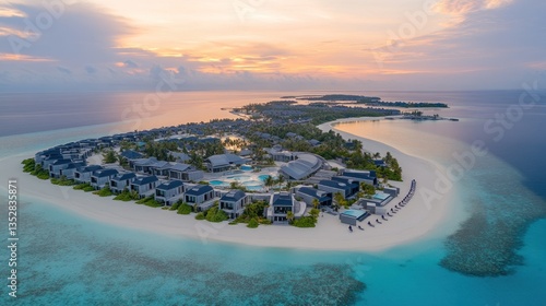 Luxurious tropical island resort at sunset. A secluded, modern getaway with pristine beaches, turquoise waters, and stylish accommodations