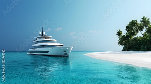 Luxurious yacht anchored near an exclusive tropical island with pristine white sand beaches surrounded by crystal clear azure waters and swaying palm trees
