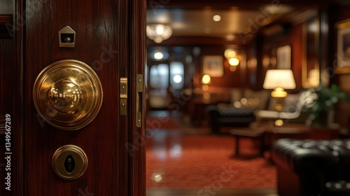 Luxury hotel interior door opening to a warm lounge