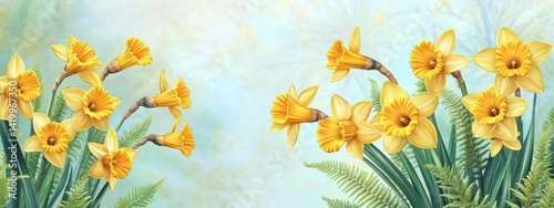 Luxury Yellow Daffodil & Fern Border with Golden Sunbursts on Blue