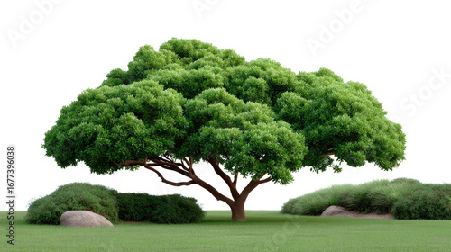 Magnificent Tree and Lush Greenery: A vibrant, healthy tree stands majestically on a bed of green grass, framed by neatly trimmed bushes and stones. a beautiful representation of nature and serenity.