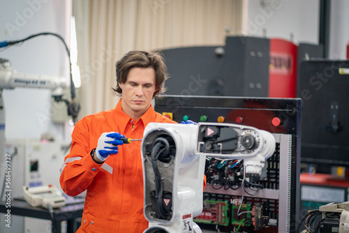Maintenance engineering repair automatic welding robotic arm machine at production line in the industry factory.