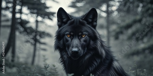 Majestic Black Wolf with Piercing Amber Eyes in Pristine Wilderness.