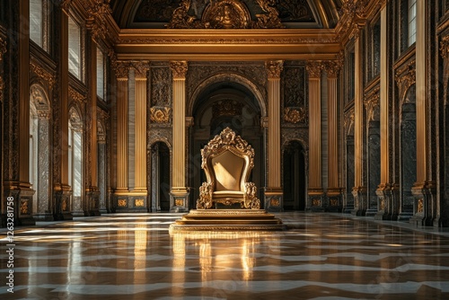 Majestic golden throne in an opulent palace hall illuminated by soft light. Generative AI