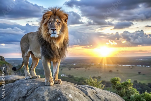 Majestic Lion on Rocky Outcrop at Sunset - Macro Photography of a Regal Animal in Golden Light