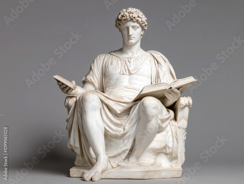 Majestic marble statue depicting a seated figure with books.
