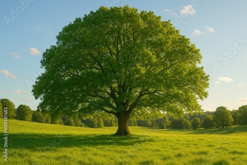 Majestic Tree in Meadow: A towering tree stands proudly in a vibrant green meadow. Its lush foliage reaches towards a clear blue sky, capturing a moment of natural serenity.
