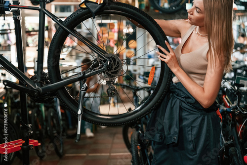 Making it clean. Repair woman in bicycle shop, working in store