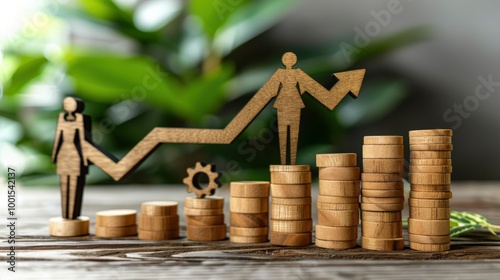 Male and female wooden figures standing on stacked coins with upward arrow between them. Represents teamwork, gender equality, business growth, financial success, symbolizes progress in partnership.