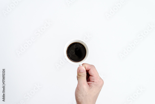 Man has holding for drinking black coffee in the morning. Black coffee cup isolated on white background concept.