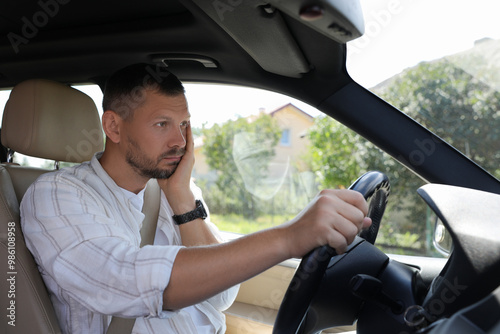 Man holding steering wheel while driving car