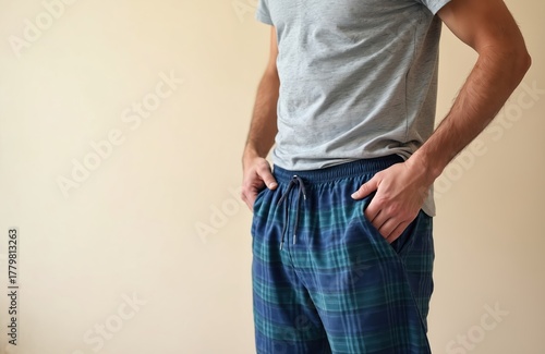Man in plaid pajama pants and gray t-shirt stands with hands in pockets against a plain background. Casual loungewear and relaxation concept.