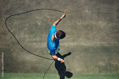 Man, jump rope and tennis court with fitness, exercise and outdoor for development, cardio and above in summer. Person, athlete and workout for sports, wellness and training with challenge in England