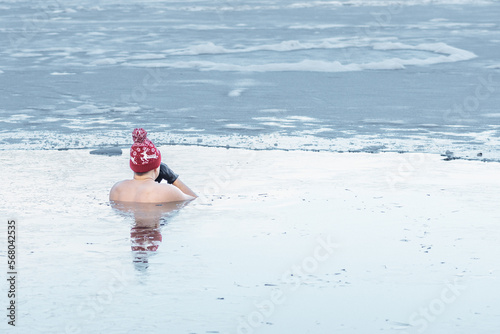 Man or boy with a warm hat and gloves ice bathing in the cold water of a lake. Wim Hof Method, cold therapy, breathing techniques, yoga and meditation