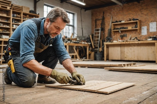 Man refurbishing shop location- laying flooring