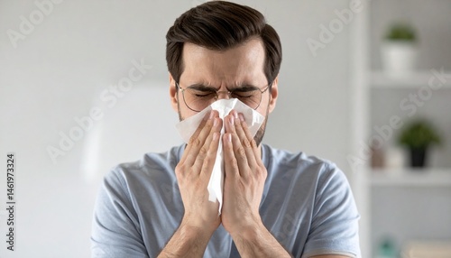 Man Sneezing in a White Handkerchief or Tissue - Symptoms of being Ill or Sick - Bacteria and Sinus Infection - Influenza, Flu, Covid, Common Cold, Germs, Hay Fever, Unwell, Runny Nose, Allergy