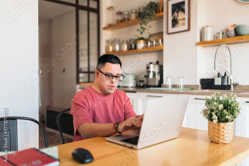 Man with Down syndrome working on laptop in kitchen