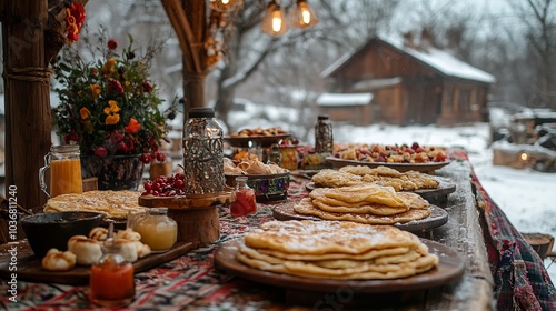 Maslenitsa celebration outdoor scene showcasing a table laden with traditional pancakes, surrounded by colorful decorations and winter landscape