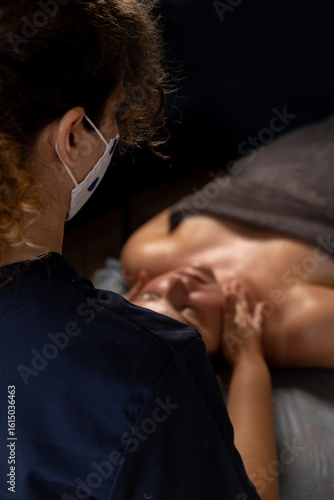 Massage therapist wearing mask providing facial treatment to client in dimly lit spa room