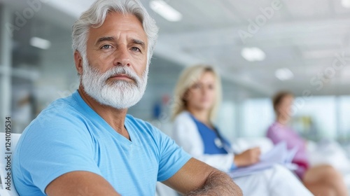 Mature caucasian male patient in hospital waiting area with medical staff in background.